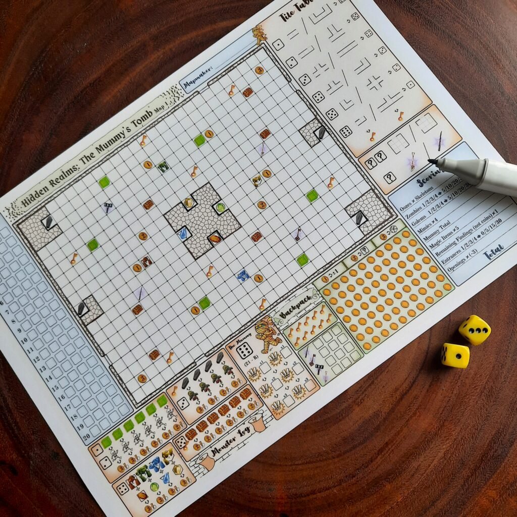 Hidden Realms: The Mummy’s Tomb is a solo roll-and-write dungeon crawler built around exploration, map-building, and careful resource use. Instead of exploring a tomb that is already laid out for you, you gradually create the layout yourself as the game unfolds.