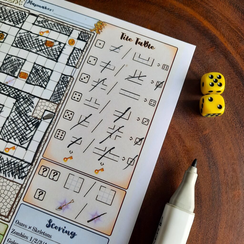 Each turn begins with rolling a couple of dice. Based on the results, you draw polyomino shapes onto your sheet to expand the tomb, forming passages and rooms while trying to keep future expansions open. As the map grows, you begin uncovering different discoveries hidden within it, including treasures, coins, keys, magic items, and monsters.